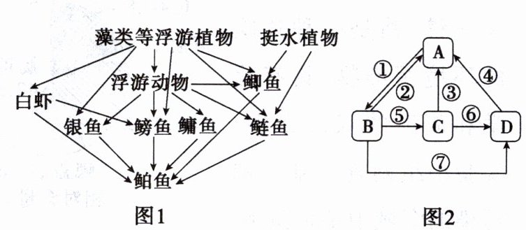 (2025·南通高三期中)图 1 是科研人员绘制的太湖某区域的部分食物网示意图。图 2 表示碳循环过程,其中 A~D 代表生态系统的相关成分。下列相关叙述正确的是( )