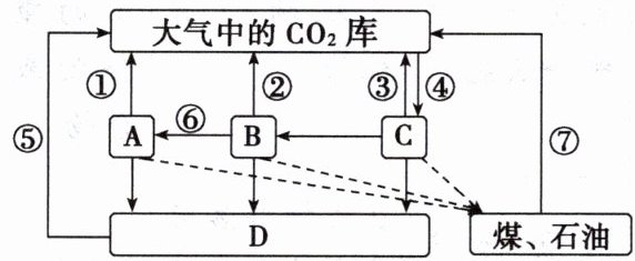 (2024·辽宁高二期末)某草原生态系统碳循环过程如图所示,其中 A、B、C、D 属于该生态系统的组成成分,①~⑦为相关途径。据图分析,下列叙述正确的是( )