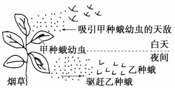 6. (创新情境)当烟草叶片受到甲种蛾幼虫的采食刺激后,会释放出一种挥发性的化学物质。这种化学物质白天会吸引甲种蛾幼虫的天敌,夜间会驱赶乙种蛾,使其不能在烟草叶片上产卵(乙种蛾幼虫也采食烟草叶片)。其过程如图所示。据以上信息回答下列问题: