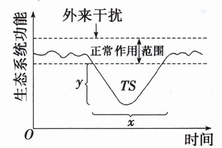 针对练4. 如下图中两条虚线之间的部分表示生态系统功能正常的作用范围。y表示一个外来干扰使之偏离这一范围的大小,x表示恢复到原状态所需的时间,曲线与正常范围之间所夹的面积可以作为总稳定性的定量指标(TS)。下列叙述正确的是( )