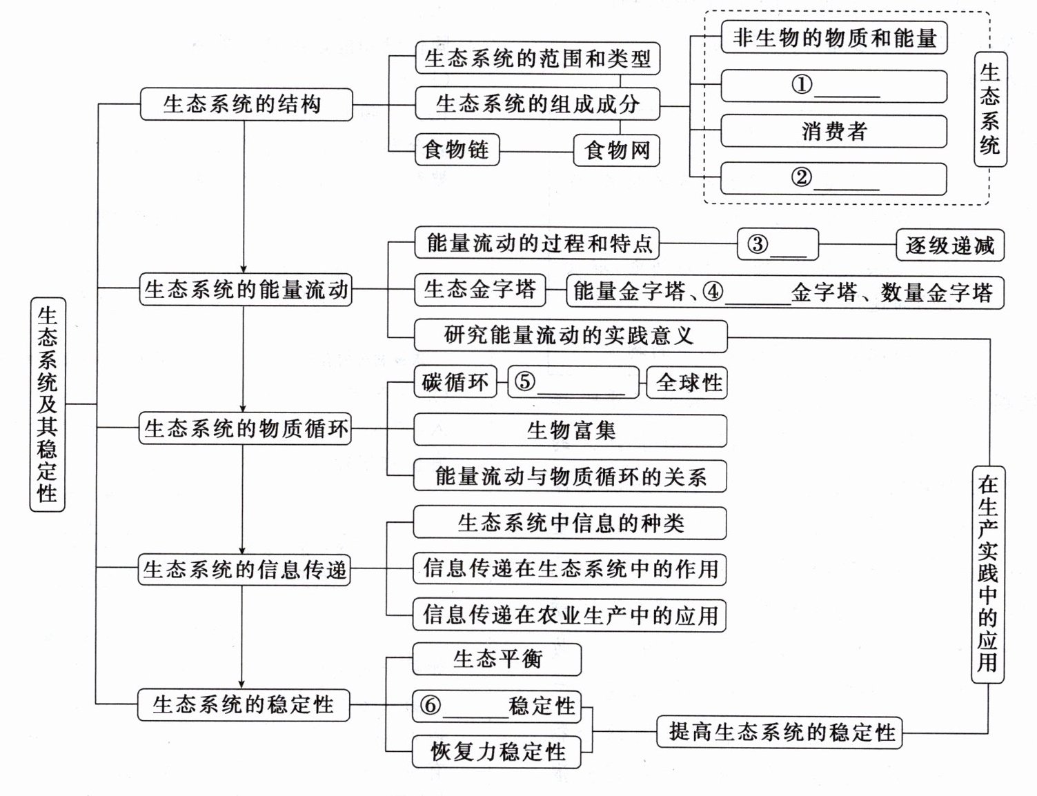①生产者 ②分解者 ③单向 ④生物量 ⑤循环往复 ⑥抵抗力