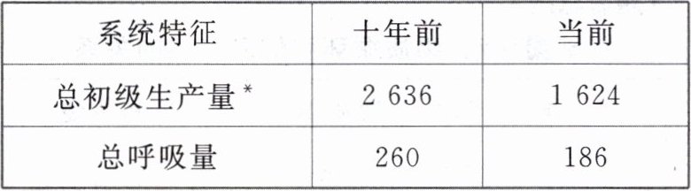 (3)分析表2数据可知,十年前生态系统成熟度=总生产量/总呼吸量= 2 636÷260= 10.14,当前生态系统成熟度= 1 624÷186= 8.73,数值更小,所以当前时期渤海生态系统成熟度较高,表示生态系统中多余的生产量减少,需要采取相应管理措施恢复渔业资源。