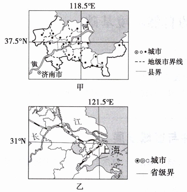 甲图为黄河三角洲示意图,乙图为长江三角洲示意图。