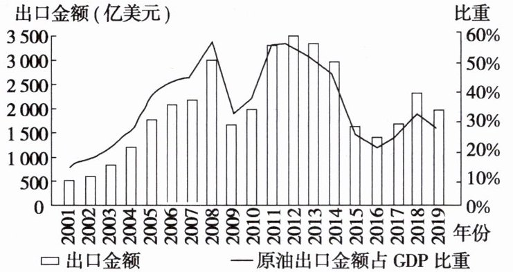 (2025·湖南益阳高二月考)沙特阿拉伯作为主要石油生产国,原油出口量较稳定,政府财政收入的绝大部分依赖于石油的出口。近年来,该国维系多年的石油经济模式遭遇空前挑战,政府推出“2030愿景”,希望摆脱对石油的依赖,推进经济多元化发展,实现经济可持续增长。下图为沙特