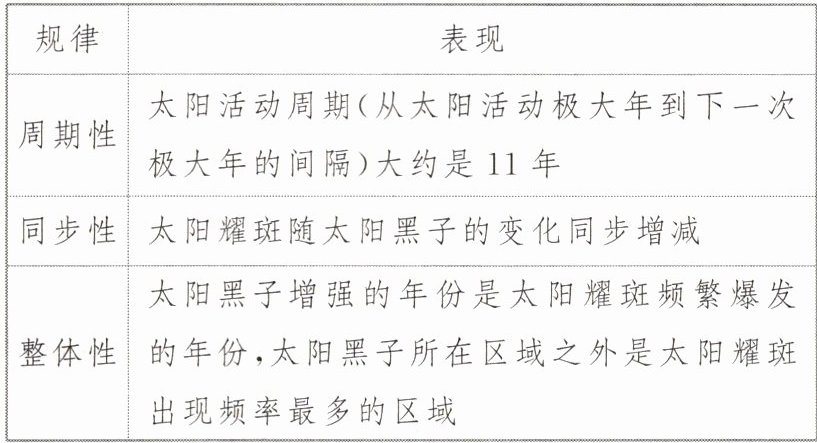 ①太阳黑子:出现在____层上的黑斑点,其数量的多少和大小是太阳活动强弱的标志。