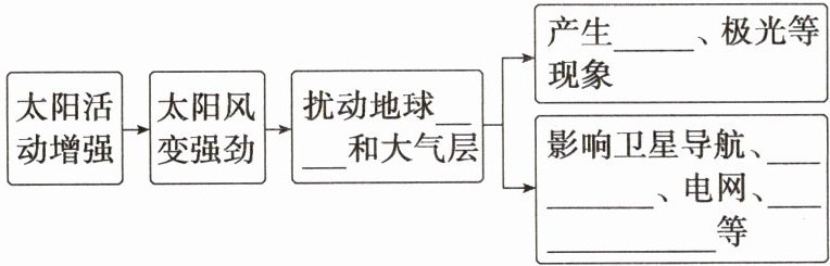 ②太阳耀斑:____层表面忽然出现的大而亮的斑块,其活动与太阳黑子活动有关。