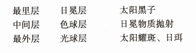 太阳大气层由内向外依次为光球层、色球层、日冕层。光球层的太阳活动是黑子;色球层的太阳活动是耀斑和日珥;日冕层的太阳活动是太阳风。