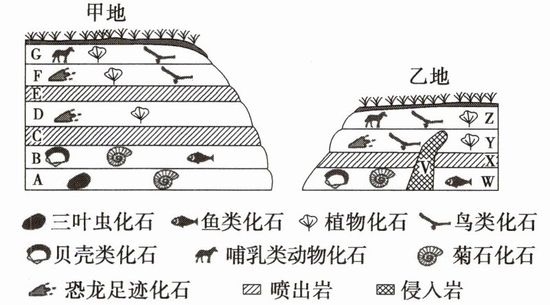 3.A 4.B 第3题,地质年代主要是依据不同地层形成的化石类型和数量划分的,通过生物的演化来划分地质历史年代,A正确。第4题,根据图片,乙地V岩层侵入到X岩层内,无法推断乙地V与X是否出现断代,A错误;根据化石的类型,乙地W岩层与甲地B岩层形成于同一时期,因此乙地X与Y形成时期缺失了甲地的C、D、E中的一部分岩层,X与Y出现断代,B正确,D错误;乙地Y地层与甲地F地层形成于同一时期,Z地层与G地层形成于同一时期,因此乙地Y与Z没有出现断代,C错误。