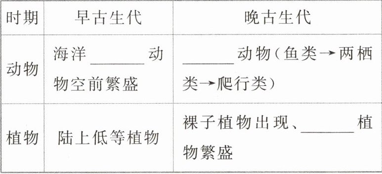 古生代:地壳运动:早期地壳剧烈变动,后期联合古陆形成;生物进化:海洋无脊椎动物繁盛(如三叶虫),中期鱼类出现,后期两栖类登陆,蕨类植物茂盛;成矿时期:重要的造煤时期。
