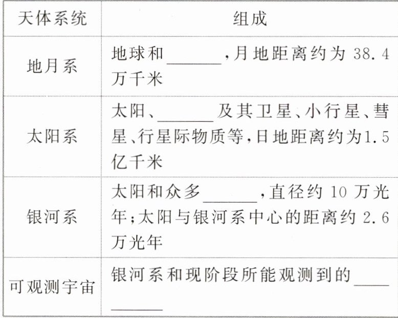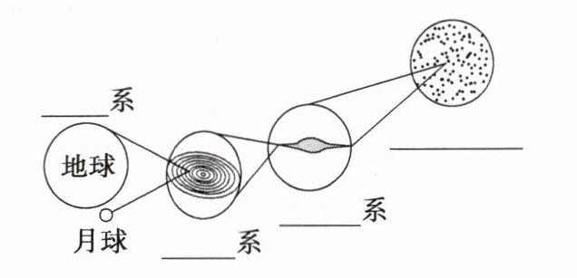 2. 层次:地球所处的天体系统分为四级。请在下图中的横线上填出各级天体系统的名称。
