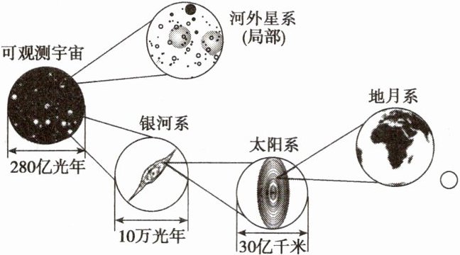 (2025·四川达州部分学校高一联考)“中国天眼”FAST是世界上最大、最灵敏的单口径球面射电望远镜。2024年5月,FAST发现了6个距离地球约50亿光年的中性氢星系,这是人类迄今直接探测到的最远的一批中性氢星系。下图为天体系统示意图。据此完成1~2题。