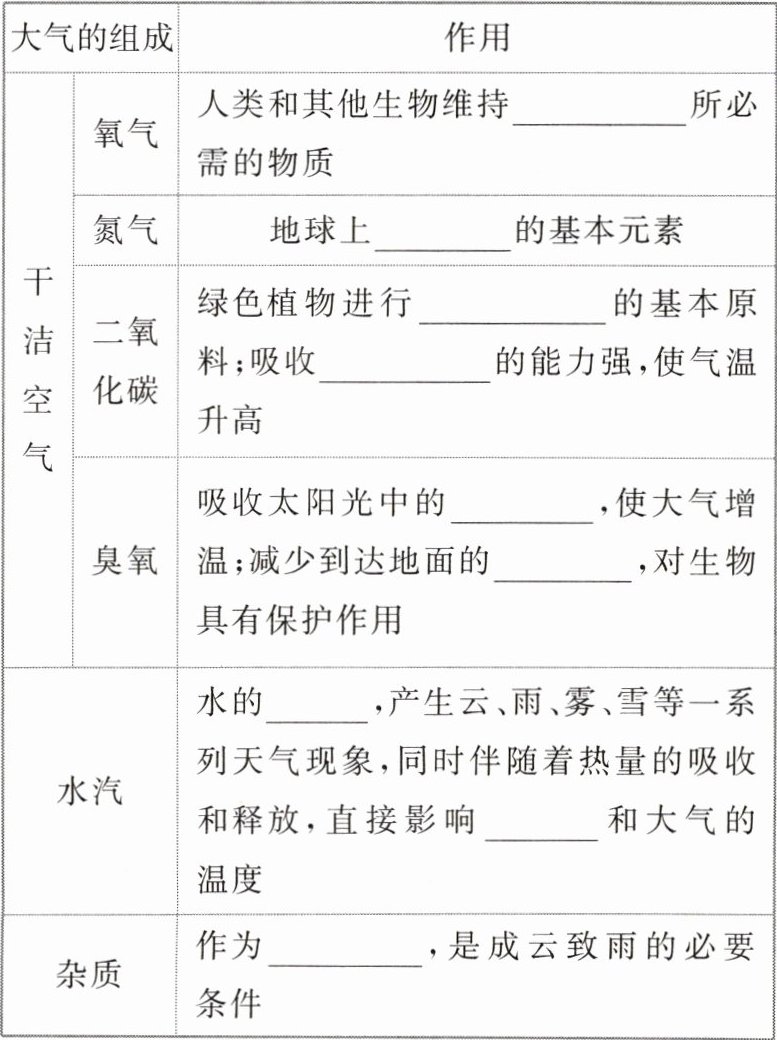 1.生命活动 生物体 光合作用 地面辐射 紫外线 紫外 线 相变 地面 凝结核 2.含量 大气污染 生态系统