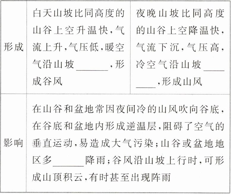2. 形成:白天,山坡比同高度的山谷升温快,暖空气沿山坡上升,形成谷风;夜晚,山坡比同高度的山谷降温快,冷空气沿山坡下滑,形成山风。影响:在山谷和盆地常因夜间冷的山风吹向谷底,使谷底和盆地内形成逆温层,阻碍空气的垂直运动,易造成大气污染。