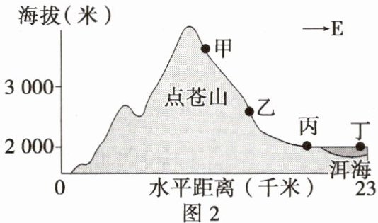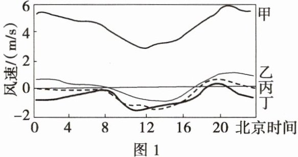 3.A 4.C 第3题,由图2可知,甲站靠近山顶,远离湖泊,远离山谷,所受到的湖陆及坡谷之间热力作用影响最小。也可从风向判断、若受湖陆及坡谷之间热力作用影响,则白天和晚上的风向会发生变化,在图1中的体现为一天中有正负值,因为风速正负值代表不同的风向。从图1可以看出,甲站一天中,风速均为正值,没有发生变化,受湖陆及坡谷之间热力作用影响小,A正确;乙、丙、丁站一天中,风速有正负值,风向发生变化,受湖陆及坡谷之间热力作用影响大,B、C、D错误。第4题,据图可知,四个观测站中甲站受遮挡较少,海拔高,风速较大,①正确;夜间盛行陆风与山风,乙站受坡向影响,下午风向转向较早(16:00左右),②错误;丙站受地形的影响,夜间由于山坡散热快,冷空气顺着山坡下沉到谷底,谷底原来较暖的空气被冷空气抬挤上升,容易形成逆温,③正确;丁站受湖面影响,气温日温差较小,④正确。故选C。