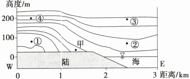 (2025·福建南平高一期末)我省某海滨城市海陆风明显。近年来,该市将甲地附近的大面积荒地开发为滨海新区。下图示意该市甲地附近某日某时刻等压面分布。据此完成1~2题。