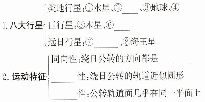 ②体积质量:分为类地行星(体积小、质量小,包括水星、金星、地球、火星)、巨行星(体积大、质量大,包括木星、土星)、远日行星(体积质量居中,包括天王星、海王星)。