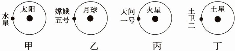 1.A 2.C 第1题,读图可知,图示四个天体系统中,甲是以恒星为中心天体的天体系统,乙以卫星为中心,丙、丁以行星为中心,因此级别最高的是甲,A正确,B、C、D错误。第2题,嫦娥五号和天问一号是人类制造并发射到宇宙空间的人造天体,水星与土卫二属于自然天体,①④错误,②③正确,故选C。