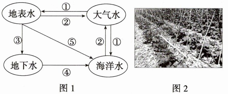 (2025·江苏盐城高一期末)我国气候干旱区,农民在耕作土壤表面铺设10~15厘米的砂石覆盖层,发展农作物种植,形成砂田农业。图1中数字代表水循环环节,图2为宁夏砂田景观图。据此完成3~4题。