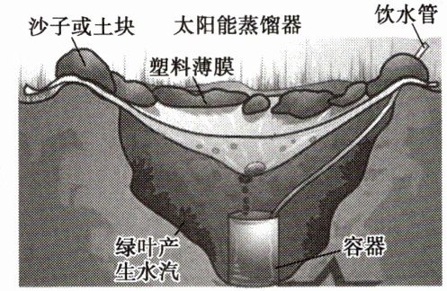 (2025·北京西城区高一期末)野外探险时为获取饮用水,可以在比较湿的地方选择一个洼地,在里面放一个容器,然后在洼地上方盖上塑料薄膜,将四周用沙子或土块压实,中间放个小石块。第二天早晨,洼地里的容器就会盛满淡水,如下图所示。据此完成1~2题。