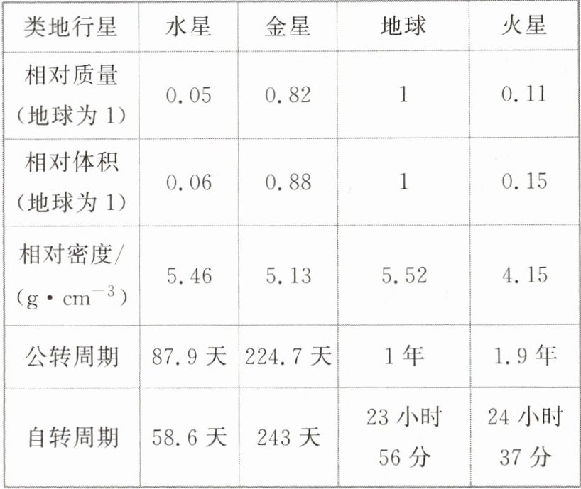 1.D 2.A 第1题,从表中信息可以看出,四颗行星的密度相近,故选D。第2题,同向性指的是各行星的绕日公转方向相同,A错误,符合题意。故选A。