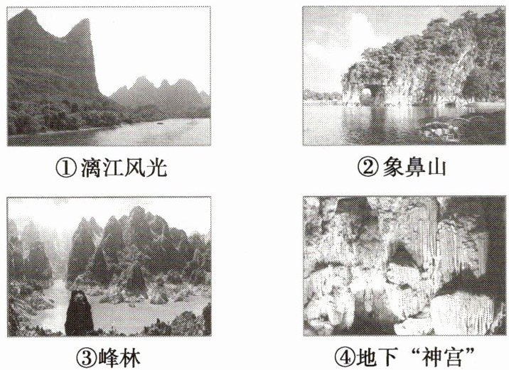 问题1.①②③图属于地表喀斯特地貌,④图属于地下喀斯特地貌;④图为溶洞,洞内有石钟乳、石笋、石柱等景观,形态各异,故称地下“神宫”。