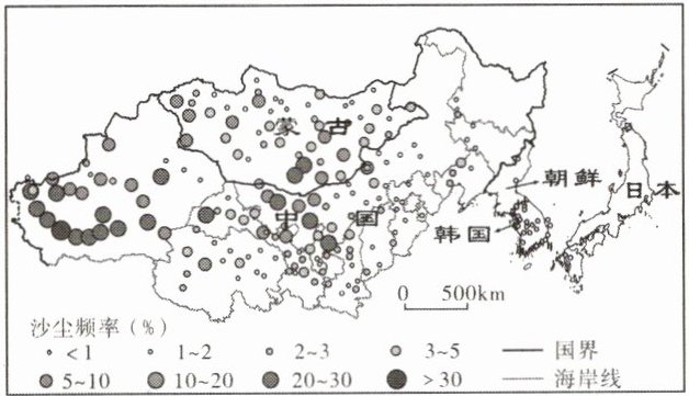 3.D 4.A 第3题,读图可知,东亚沙尘暴频率空间分布不均,自西北向东南频次逐渐减少,A、B错误;其中,在我国新疆南部和内蒙古高原西部、蒙古中南部,沙尘暴发生频率较高,特别是新疆的塔克拉玛干沙漠(或塔里木盆地的南部)最高;而内蒙古东部、东北平原、朝鲜、韩国和日本等地沙尘暴频率较低,C错误,D正确。第4题,蒙古多沙尘暴天气的月份是春季,因此3月符合题意。A正确。