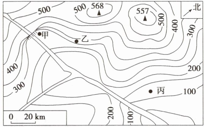 3.B 4.A 第3题,结合图中信息可知,图中等高距为50米;结合指向标可知,图示区域西侧海拔最高,海拔为550~600米,东侧海拔最低,海拔为0~50米,两地海拔范围交叉相减得出相对高度范围,为500~600米,因此580米符合最大高差,B正确。第4题,该地以低山丘陵为主;甲处河流流经陡崖,形成瀑布,①②正确;河流干流自西向东流;乙地等高线较密,坡度较丙地大,③④错误。 故选A。