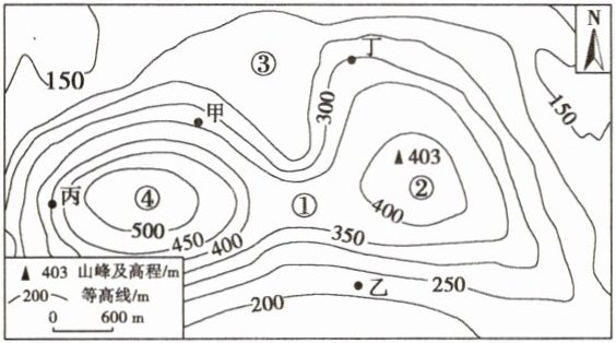 1.C 2.C 第1题,读图,①位于两个山顶之间的低地,表示鞍部;②和④等高线闭合,中部高四周低,表示山峰;③等高线向高处凸,表示山谷,山谷最高处为鞍部、两侧为山脊,故想要观察山脊、山谷和鞍部等微地形,应选择的观察点是③,C正确。第2题,丁地为阴坡(北坡),乙地为阳坡(南坡),A错误;图中等高距为50米,乙地海拔(200~250)米,甲地海拔(300~350)米,故甲地海拔高于乙地,B错误;丙