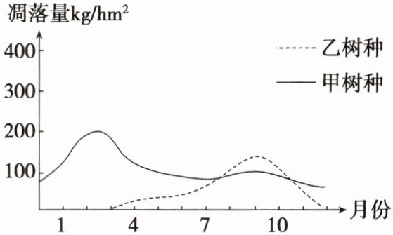 (2025·江苏南京高二下阶段练习)植被落叶有两种情况:一是干旱或寒冷季节来临时,植物为减少蒸腾,保持体内热量和水分而落叶;二是树木在新叶长出后,老叶渐次脱落,形成植被终年常绿景象。下图为我国北回归线以北某学校地理研学小组记录的当地两树种落叶数量的逐月变化示意图。据此完成1~2题。