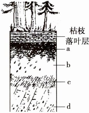 1.C 2.C 第1题,有机层是土壤表层的植物残体堆积层,以分解和半分解的有机质为主,对应图中的枯枝落叶层;腐殖质层是土壤腐殖质积累而形成的暗色土层,呈灰黑色或黑色,分布在有机质层以下,对应图中的a,A错误;淋溶层是由于淋溶作用使得矿物质迁移和损失的土层,有机质含量低,色泽较淡,分布在腐殖质层之下,对应图中的b,B错误;淀积层常与淋溶层相伴存在,是土壤物质沉淀、积累的层次,色泽较深,分布在淋溶层之下,对应图示的c,C正确;位于淀积层之下的是母质层,对应图中的d,D错误。 第2题,由材料可知,该地年平均气温-4~0℃,应为亚寒带,A错误;年降水量500~600毫米,为半湿润地区,气候并不干旱,B错误;气温低,有机质分解慢,C正确;水土流失会减少有机质含量,D错误。