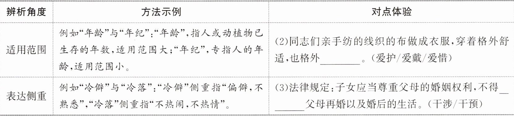 (2)“爱护”“爱戴”“爱惜”意思相近,但是适用范围不同。“爱护”,用于对人或物的保护,是上对下;用于物,多指机器、国家财产。“爱戴”,只用于人,且限于下对上、群众对领袖、学生对老师的敬爱与拥护。“爱惜”,只用于珍惜会消耗掉的东西,如时间、生命、粮食等。