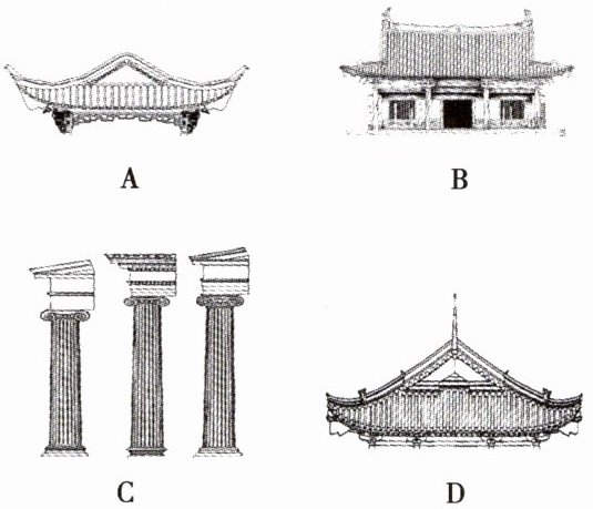 1.(必修下册第三单元)下列各图中能够体现《中国建筑的特征》中所描述的斗拱建筑特点的一项是( )