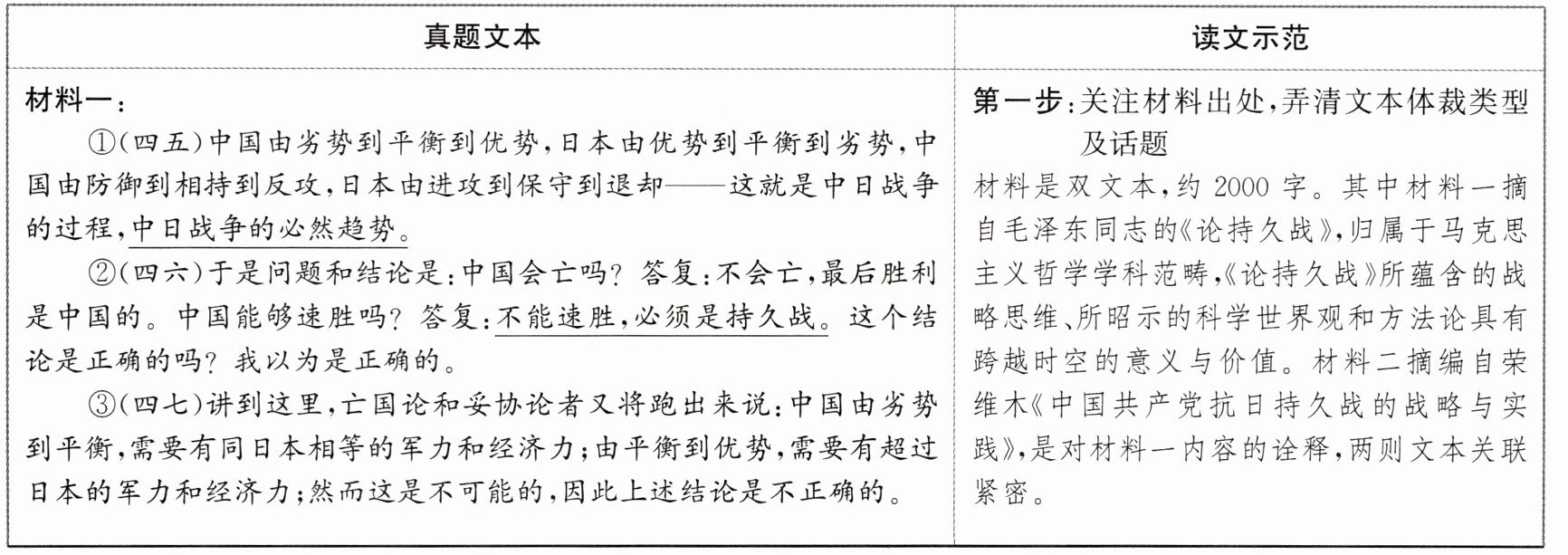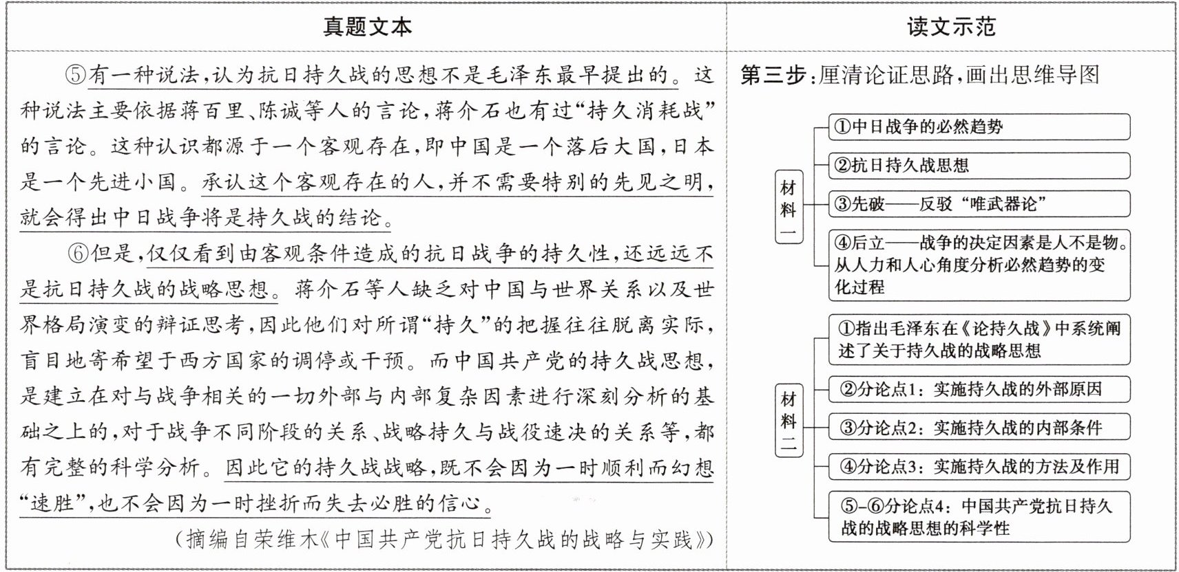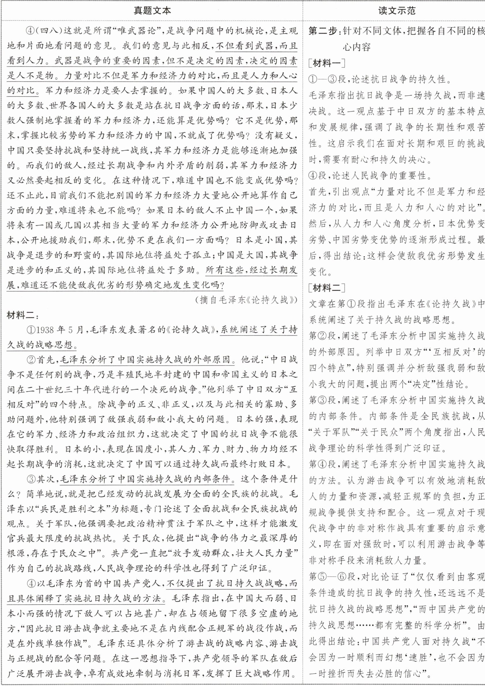 2.A A项错误,材料一第④段提出日本劣势的理由是“力量对比不但是……而且是人力和人心的对比”,并进一步提出“军力和经济力是要人去掌握的”的观点,并进行假设“如果中国……,那末,日本少数人……”,在删掉大前提的情况下,分析“日本的军力和经济力并不占优势”,属于断章取义、强加因果。