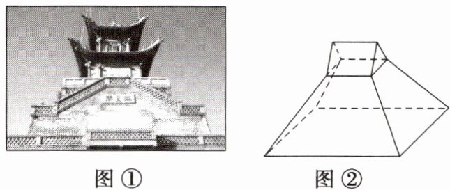 (3)攒尖是中国古建筑中屋顶的一种结构形式,兰州市著名景点三台阁(如图①)的屋顶部分是典型的攒尖结构。如图②所示是某研究性学习小组制作的三台阁仿真模型的屋顶部分,它可以看作是不含下底面的正四棱台和正三棱柱的组合体,已知正四棱台上底边、下底边、侧棱的长度(单位:$dm$)分别为 2,6,4,正三棱柱各棱长均相等,则该结构的表面积为____ $dm^{2}$。