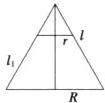 典例$2 (2)\frac{16π}{3} (2)$设圆锥的底面半径为R,母线长为l,则$r = \frac{1}{3},$由已知可得,$\frac{\pi}{3}l = 2πR,$所以l = 6.如图,作出圆锥、圆台的轴截面,则有$\frac{l - l₁}{l} = \frac{r}{R},$解得l₁ = 4.所以圆台的侧面积为$π(R + r)l₁ = 4 × (1 + \frac{1}{3})π = \frac{16π}{3}. $