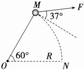 水平桌面上,长$6m$的轻绳一端固定于$O$点,如图所示(俯视图),另一端系一质量$m = 2.0kg$的小球。现对小球施加一个沿桌面大小不变的力$F = 10N$,$F$拉着物体从$M$点运动到$N$点,$F$的方向始终与小球的运动方向成$37^{\circ}$角。已知小球与桌面间的动摩擦因数$\mu = 0.2$,不计空气阻力,取$g = 10m/s^2$,$\sin37^{\circ}=0.6$,$\cos37^{\circ}=0.8$,则下列说法正确的是( )