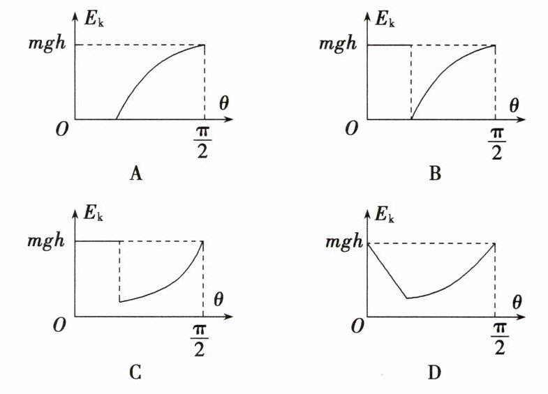 A 由题知小滑块在高度为h的斜面顶端由静止释放,则对于小滑块下滑的过程应用动能定理可得$mgh-\mu mg\cos\theta·\frac{h}{\sin\theta}=mgh-\frac{\mu mgh}{\tan\theta}=E_{k}(\tan\theta\geq\mu)$,当$\theta=\frac{\pi}{2}$时,$E_{k}=mgh$;随着$\theta$减小,$\tan\theta$逐渐减小,物块滑到斜面底端时的动能逐渐减小;当重力沿斜面方向的分力小于等于最大静摩擦力时,有$mgsin\theta\leq\mu mg\cos\theta$,解得$\mu\geq\tan\theta$,此后继续减小$\theta$,物块都不再下滑,则此后小滑块的动能一直为零,故A正确。 故选A。