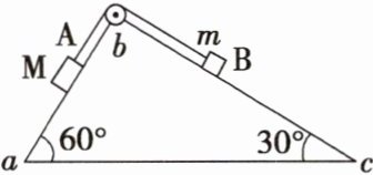 例 3 (多选) 如图所示,楔形木块 $ abc $ 固定在水平面上,粗糙斜面 $ ab $ 与水平面的夹角为 $ 60^{\circ} $,光滑斜面 $ bc $ 与水平面的夹角为 $ 30^{\circ} $,顶角 $ b $ 处安装一定滑轮。质量分别为 $ M $、$ m $ ($ M > m $) 的两滑块 $ A $ 和 $ B $,通过不可伸长的轻绳跨过定滑轮连接,轻绳与斜面平行。两滑块由静止释放后,沿斜面做匀加速运动,$ A $、$ B $ 不会与定滑轮碰撞。若不计滑轮的质量和轮与轴间的摩擦,在两滑块沿斜面运动的过程中( )