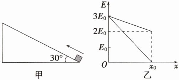 例 2 (多选)(2024·福建三明市模拟) 如图甲所示,倾角为 $ 30^{\circ} $ 的斜面固定在水平地面上,一木块以一定的初速度从斜面底端开始上滑。若斜面足够长,上滑过程中木块的机械能和动能随位移变化的关系图线如图乙所示,则下列说法正确的是( )