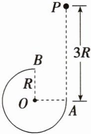 例 1 (多选) 如图所示,在竖直平面内有一半径为 $ R $ 的 $ \frac{3}{4} $ 圆弧轨道,半径 $ OA $ 水平、 $ OB $ 竖直,一个质量为 $ m $ 的小球自 $ A $ 的正上方 $ P $ 点由静止开始自由下落,小球沿轨道到达最高点 $ B $ 时恰好对轨道没有压力。已知 $ AP = 3R $,重力加速度为 $ g $,则小球从 $ P $ 点到 $ B $ 点的运动过程中( )