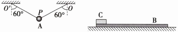 如图,质量为 $2\ \mathrm{kg}$ 的小球 $A$(视为质点)在细绳 $O'P$ 和 $OP$ 作用下处于平衡状态,细绳 $O'P=OP=1.6\ \mathrm{m}$,与竖直方向的夹角均为 $60^{\circ}$。质量为 $6\ \mathrm{kg}$ 的木板 $B$ 静止在光滑水平面上,质量为 $2\ \mathrm{kg}$ 的物块 $C$ 静止在 $B$ 的左端。