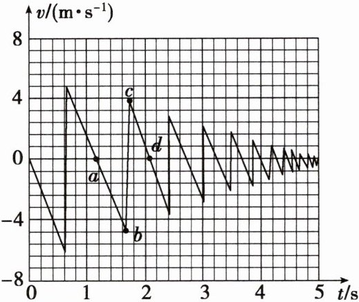 例 2 (2024·河北卷·T3)篮球比赛前,常通过观察篮球从一定高度由静止下落后的反弹情况判断篮球的弹性。某同学拍摄了该过程,并得出了篮球运动的 $v - t$ 图像,如图所示。图像中 $a$、$b$、$c$、$d$ 四点中对应篮球位置最高的是( )