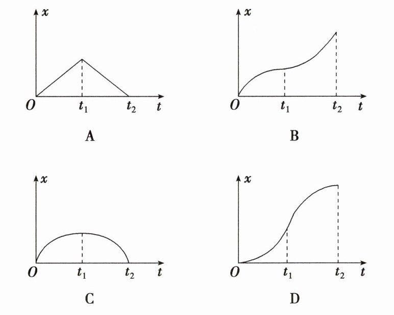 D $x - t$图像在某点切线的斜率表示瞬时速度$v$,小车在$0\sim t_{1}$时间内从静止开始做匀加速直线运动,则$x - t$图像的斜率从零开始不断增大;$t_{1}\sim t_{2}$时间内小车开始做匀减速直线运动至速度为零,则$x - t$图像的斜率不断减小至零,故D正确,A、B、C错误。