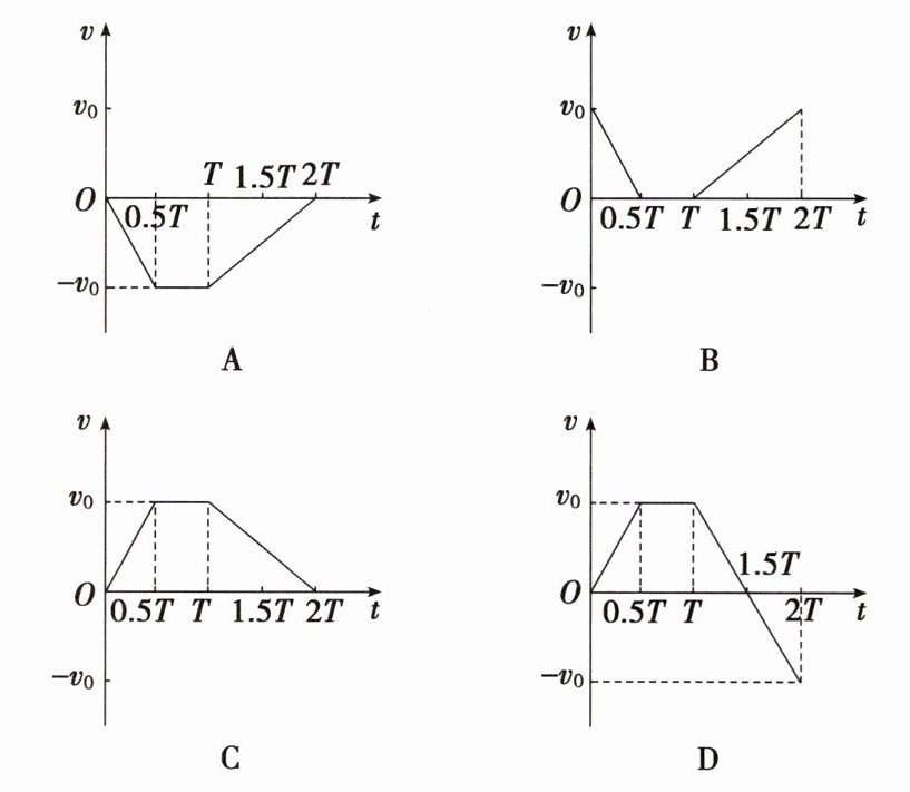 D 由题图可知,$0\sim0.5T$时间内的加速度与$T\sim2T$时间内的加速度大小相等,方向相反,则对应时间内的$v - t$图像的斜率的绝对值相等,正负不同,可知D正确,A、B、C错误。
