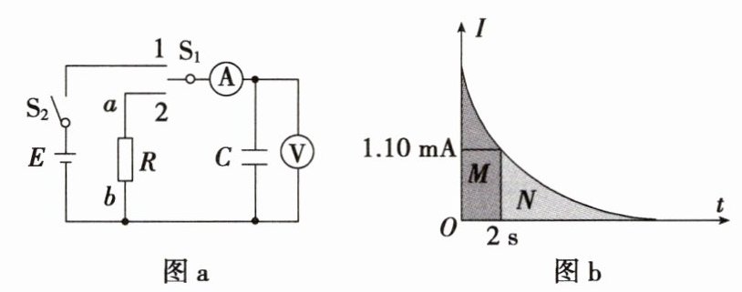(2)先后断开开关 $ S_2 $、$ S_1 $,将电流表更换成电流传感器,再将 $ S_1 $ 接 2,此时通过定值电阻 $ R $ 的电流方向为____(选填“$ a \to b $”或“$ b \to a $”),通过传感器将电流信息传入计算机,画出电流随时间变化的 $ I - t $ 图像,如图 b,$ t = 2 \, s $ 时 $ I = 1.10 \, mA $,图中 $ M $、$ N $ 区域面积比为 $ 8 : 7 $,可求出 $ R = $____ $ k\Omega $(保留 2 位有效数字)。