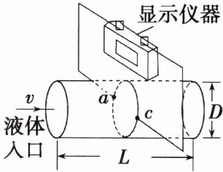 例5 某化工厂的排污管末端安装了如图所示的流量计,测量管由绝缘材料制成,其长为$L$、直径为$D$,左右两端开口,在前后两个内侧面$a$、$c$固定有金属板作为电极,匀强磁场方向竖直向下(未画出)。污水(含有大量的正、负离子)充满管口从左向右流经该测量管时,$a$、$c$两端的电压为$U$,显示仪器显示污水流量为$Q$(单位时间内排出的污水体积),则( )
