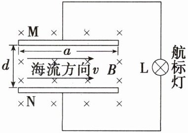 例4 (多选)海水中含有大量的正、负离子,并在某些区域具有固定的流动方向,有人据此设计并研制出“海流发电机”,可用作无污染的电源,对海洋航标灯持续供电。“海流发电机”的工作原理如图所示,用绝缘防腐材料制成一个横截面为矩形的管道,在管道上、下两个表面装有防腐导电板$M$、$N$,板长为$a$、宽为$b$(未标出),两板间距为$d$,将管道沿着海水流动方向固定于海水中,将航标灯$L$与两导电板$M$和$N$连接,加上垂直于管道前后面向后的匀强磁场,磁感应强度大小为$B$,海水流动方向向右,海水流动速率为$v$,已知海水的电阻率为$\rho$,航标灯电阻不变且为$R$。则下列说法正确的是( )