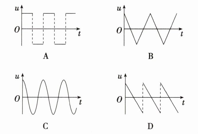 8. (2023·辽宁卷·T4)如图,空间中存在水平向右的匀强磁场,一导体棒绕固定的竖直轴 OP 在磁场中匀速转动,且始终平行于 OP。导体棒两端的电势差 u 随时间 t 变化的图像可能正确的是( )