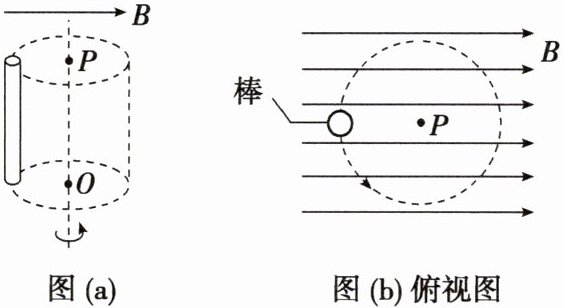 【解析】导体棒绕竖直轴OP匀速转动,始终平行于OP,故棒上各点做半径为r的匀速圆周运动,速度大小v=ωr(ω为角速度)。磁场水平向右(设为x轴方向),棒上各点速度方向为圆周切线(水平方向),与磁场夹角θ=ωt(随时间均匀变化)。