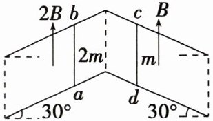 5. (多选)(2024·黑吉辽卷·T9)如图,两条“∧”形的光滑平行金属导轨固定在绝缘水平面上,间距为 L,左、右两导轨面与水平面夹角均为 30°,均处于竖直向上的匀强磁场中,磁感应强度大小分别为 2B 和 B。将有一定阻值的导体棒 ab、cd 放置在导轨上,同时由静止释放,两棒在下滑过程中始终与导轨垂直并接触良好。ab、cd 的质量分别为 2m 和 m,长度均为 L。导轨足够长且电阻不计,重力加速度为 g。两棒在下滑过程中( )